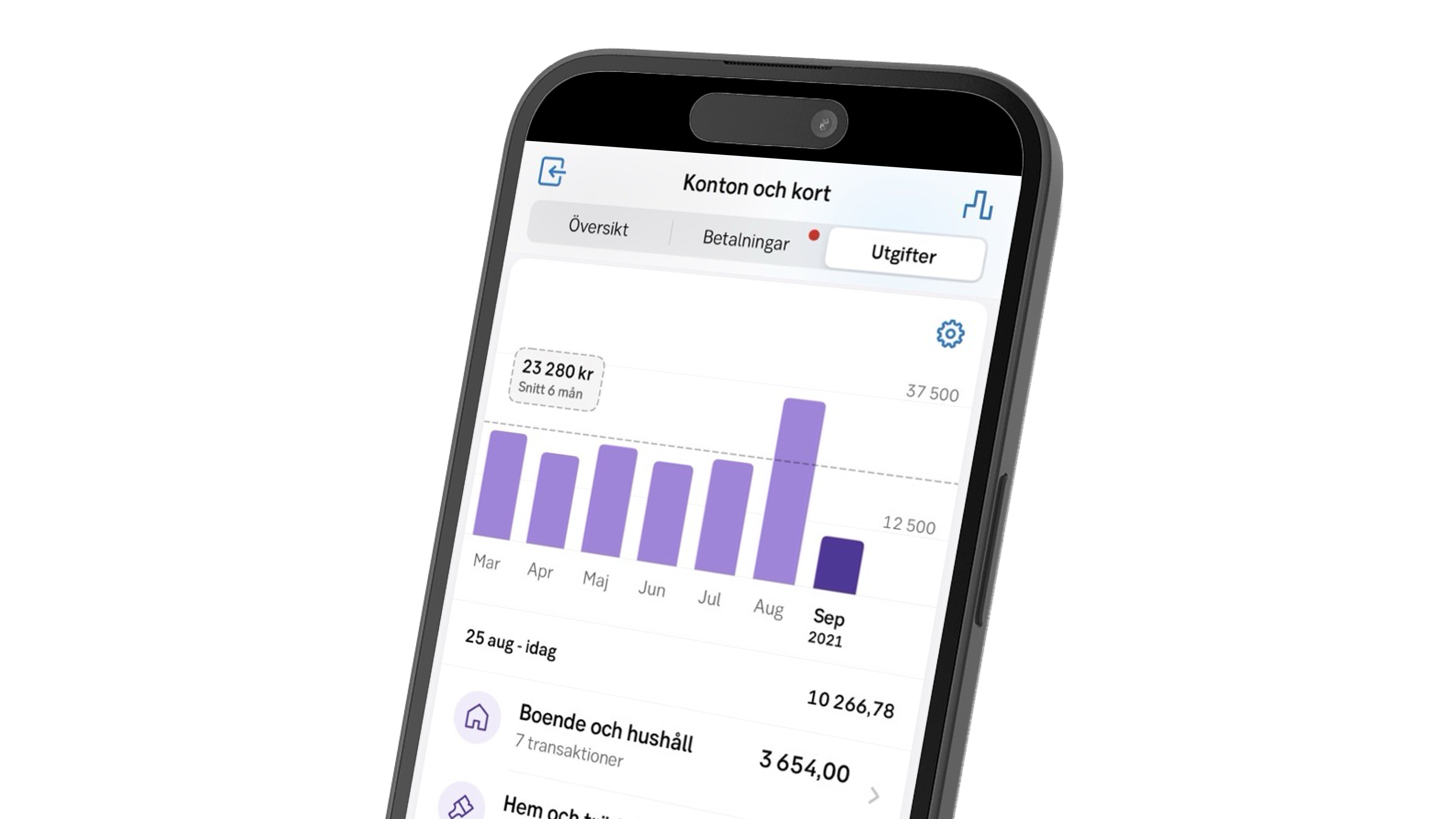Med utgiftsdiagrammet i vår app ser du hur mycket pengar du har lagt på olika saker varje månad. Det gör att du kan hålla koll på dina utgifter och att du kan se förändringen mellan olika månader.